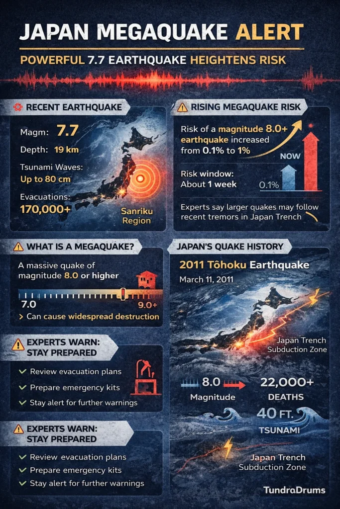 Japanese authorities have warned of a slightly increased risk of a major “megaquake” following a powerful 7.7 magnitude earthquake that struck off the country’s northern coast on Monday.