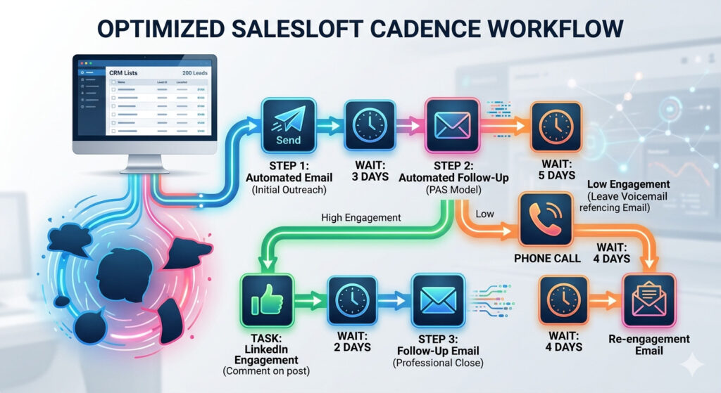 We need to stay consistent to hit our numbers, but doing it one by one is a recipe for total burnout. This is where the concept of a “rhythm” or a sequence comes in. In the Salesloft world, we call these Salesloft Cadences. Think of them not as a robot taking over your job, but as a digital assistant that keeps you on track, so you never have to guess who to call next or what to say.
