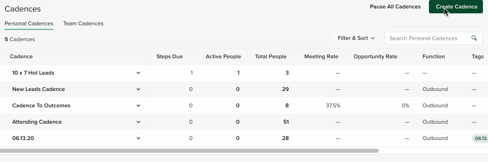 To create one, head to the Cadences tab and click “Create Cadence.” Give it a name that makes sense for the situation — “Post-Demo Follow-Up” or “Reengaging Cold Leads” both work fine. Then start adding steps.