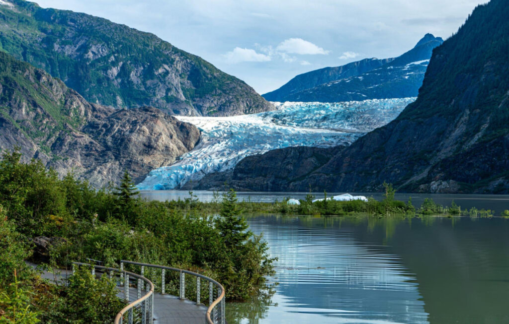About 13 miles from downtown, Mendenhall Glacier is the city’s most visited natural landmark. It stretches half a mile wide with ice up to 1,800 feet deep, and the surrounding recreation area has trails for nearly every fitness level. The walk to the visitor pavilion takes around 90 minutes and includes a solid overlook. The Nugget Falls Trail, roughly two miles round trip, leads to a roaring waterfall right at the glacier’s edge.
