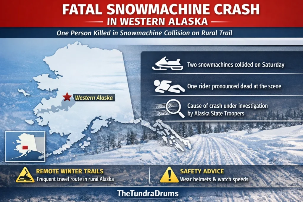 A snowmachine collision in western Alaska left one person dead after two machines crashed along a winter trail Saturday, according to the Alaska State Troopers.